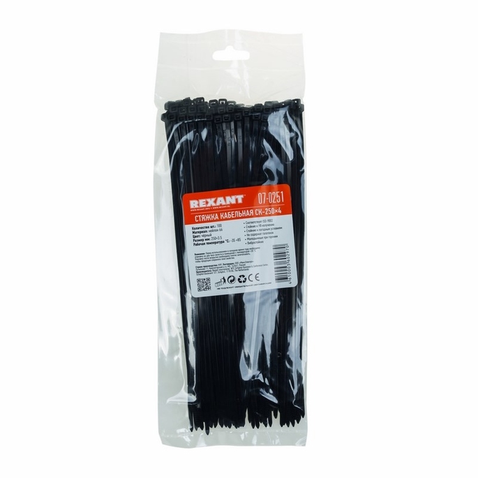 Стяжкa Rexant нейлоновая 250x3,6 мм черная (100 шт)