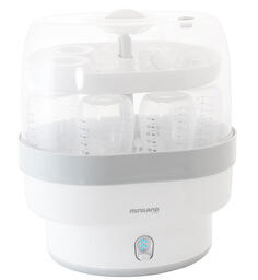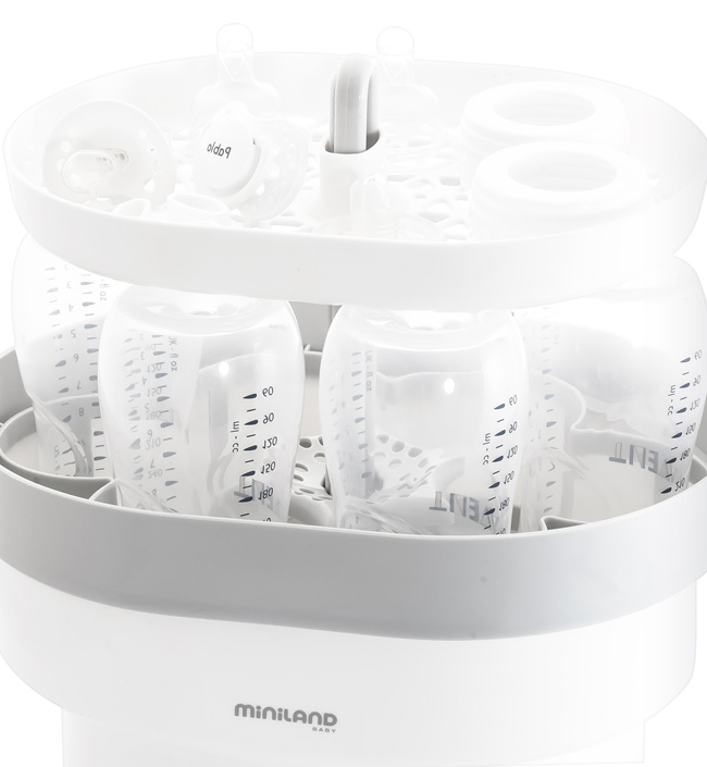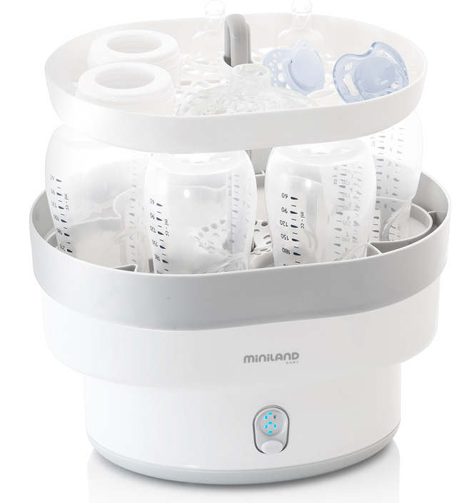 Стерилизует все виды бутылок. Небольшая детская посуда, а также аксессуары для молокоотсосов могут быть размещены в специальном отсеке.