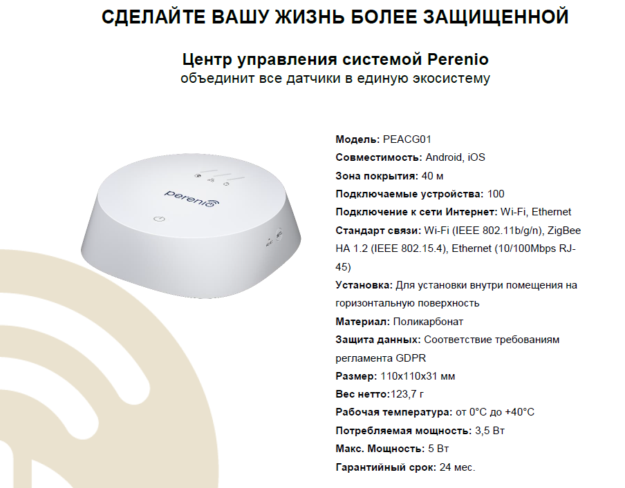 - Дополнительное описание Основа системы. К нему подключаются датчики и камеры. С помощью технологии ZigBee он получает сигналы от устройств и отправляет уведомления на смартфон через WiFi. Устройство способно поддерживать до 100 датчиков, установленных в радиусе 60 метров.