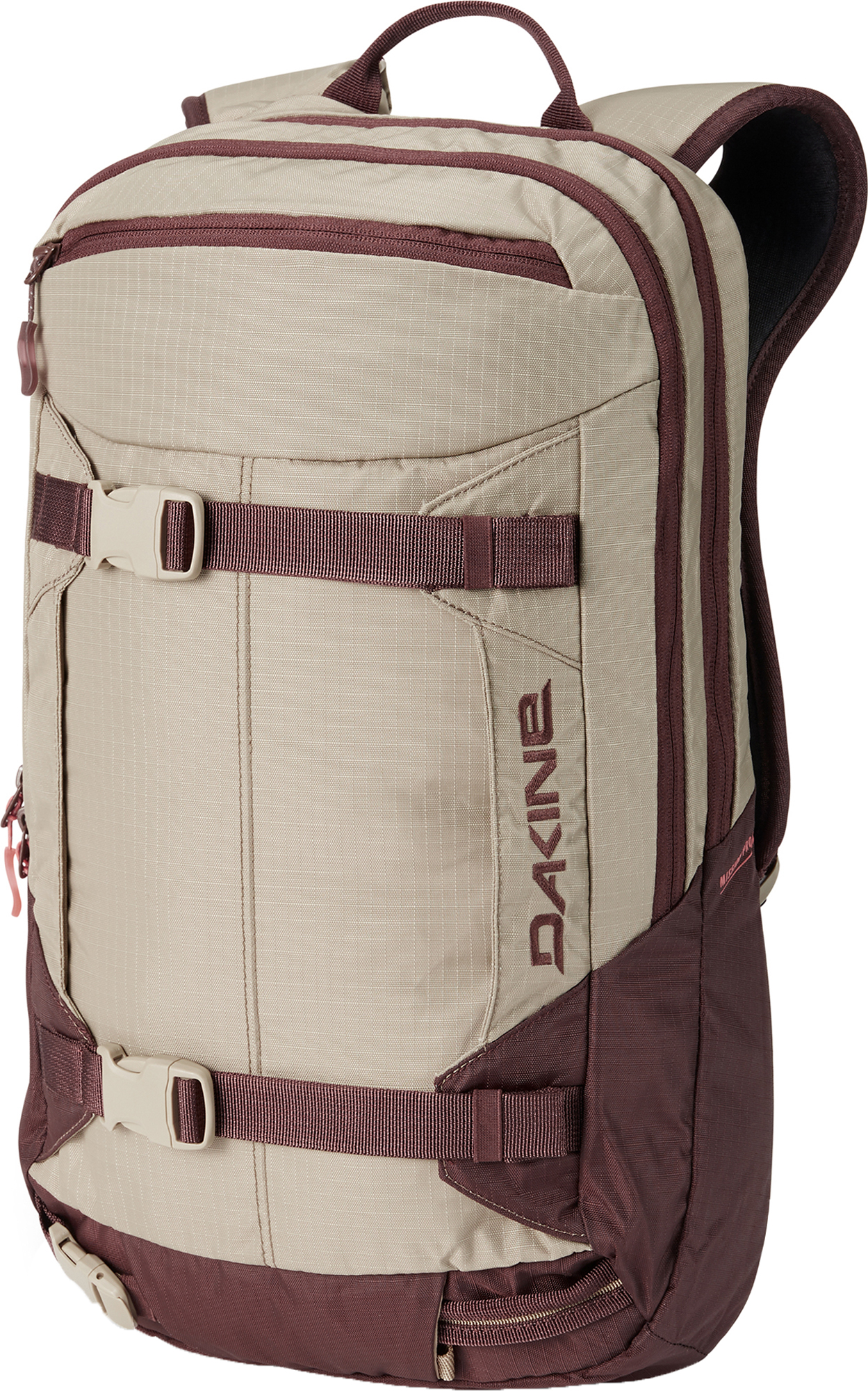 Рюкзак Dakine - отличный выбор для катания в горах. Лямки выполнены с учетом особенностей женской фигуры. Сноуборд к рюкзаку крепится вертикально, а лыжи - диагонально. В спинку можно вставить дополнительную защиту. В модели предусмотрен карман для лавинного оборудования и карман для маски из мягкого флиса. Рюкзак совместим с гидратором, шланг которого протягивается внутри плечевой лямки. Также в модель можно вставить гарнитуру от рации. В грудной перемычке расположен встроенный свисток.