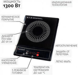 Настольная индукционная плита, количество конфорок/зон нагрева 1, мощность 1300 Вт, материал варочной панели керамика, электронное управление, дисплей, термостат, ширина 28 см.