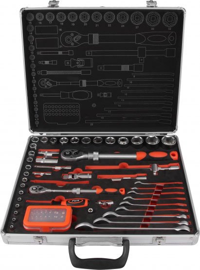 - Наличие в наборе Удлинители 1/4", Удлинители 1/2", Трещотка 1/4", Трещотка 1/2", Торцевые головки 1/4", Торцевые головки 1/2", Отвертка под биты, Головки свечные, Гаечные ключи, Биты