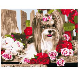 Картина по номерам 30х40 Рыжий кот Собачка с бантиком в цветах Х-3389