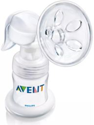 Ручной поршневой молокоотсос. Материал присоски: силикон. Комплектация: ручной молокоотсос, отделение для бутылочки/крышки воронки, ультрамягкая соска для новорожденных, бутылочка для хранения грудного молока (125 мл), крышка для хранения молока, запасные детали, дорожный контейнер для сосок для новорожденных.