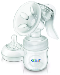 Ручной поршневой молокоотсос. Материал присоски: силикон. Комплектация: корпус молокоотсоса с ручкой, массажная насадка стандартного размера, бутылочка серии Natural 125 мл, ультрамягкая соска для новорожденных, пакеты для хранения молока, крышка для транспортировки, крышка для хранения молока, пробный комплект вкладышей для бюстгальтера.