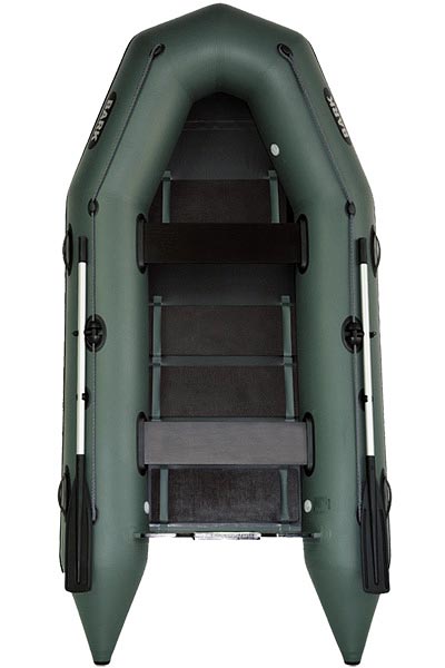 Лодка надувная моторная. Трехместная. Три гермоотсека. Дно эластичное + слань днищевая/slat flooring. Грузоподъемность 400 кг. Вес комплекта 35 кг.