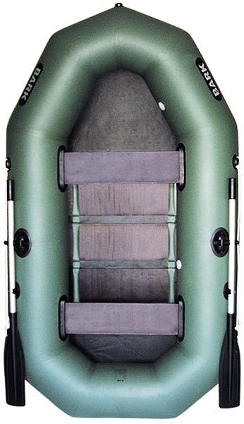 Лодка надувная гребная. Двухместная. Два гермоотсека. Дно эластичное + слань днищевая/slat flooring. Грузоподъемность 197 кг. Вес комплекта 18 кг.