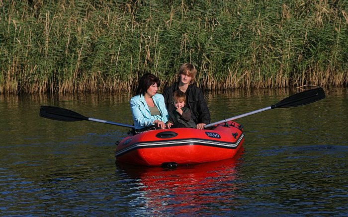 Двухместная надувная гребная лодка. Наличие трех днищевых сланей. Вес лодки вместе с веслами составляет 20 кг. Грузоподъемность 233 кг. Два гермоотсека, армированный ПВХ материал. Малая осадка судна позволяет пересекать мелководье и заросшие участки водоемов. Плотность материала: 800 г/м2. Диаметр борта: 34 см.