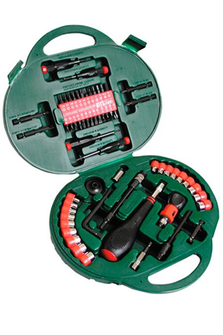 - Наличие в наборе Удлинители 1/4", Торцевые головки 1/4", Торцевые головки 1/2", Отвертки, Отвертка под биты, Биты