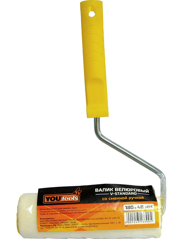 Велюровый валик YOURTOOLS VELUR V-STANDARD со сменной ручкой используется для нанесения всех видов лаков, а также алкидных, уретано-алкидных, масляных красок и алкидных эмалей. Имеет шубку с ворсом высотой 4 мм из натуральной шерсти. Бесшовное исполнение шубки позволяет наносить ровное, качественное покрытие. Размер валика составляет 180х48 мм.