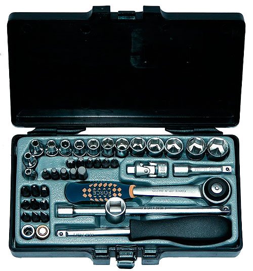 - Наличие в наборе Удлинители 1/4"; Трещотка 1/4"; Торцевые головки 1/4"; Отвертка под биты; Биты