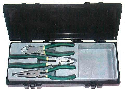 Набор шарнирно-губцевого инструмента, состоящий из 3 предметов. Набор в кейсе. В набор входят: бокорезы, пассатижи, длинногубцы.