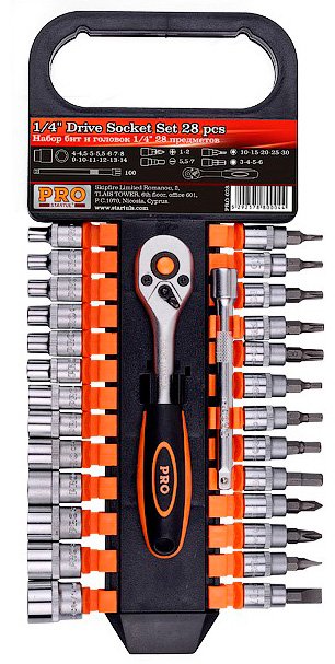 - Наличие в наборе Удлинители 1/4"; Трещотка 1/4"; Торцевые головки 1/4"; Биты