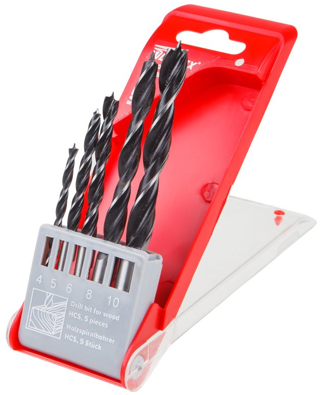 Набор сверл по дереву. Хвостовик: цилиндрический. Острие М-образное центрирующее, 2 режущие кромки. Диаметр: 4 - 5 - 6 - 8 - 10 мм.