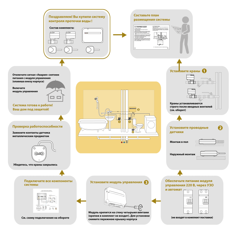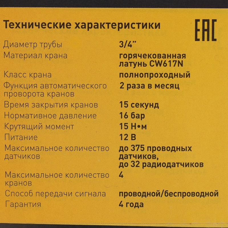 Применение продуктаСистема контроля протечки воды, оснащенная модулем WiFi для управления системой через приложение на смартфоне. Датчик передает сигнал о протечки на модуль управления, который приводит в действие шаровый кран, перекрывающий подачу воды. Особенности: Оповещение об аварии на смартфон через приложение в фоновом режиме через пуш-уведомлени• Мониторинг показаний счетчиков расхода горячей и холодной воды на экране смартфона • Индикация состояния шарового крана (откр./закр.) на экране смартфона. • Индикация состояния резервСостав комплекта: Модуль управления WiFi - 1 шт., Кран шаровый с электроприводом - 2 шт., беспроводной датчик контроля протечки воды - 2 шт., инструкция - 1 шт., коробка - 1 шт.