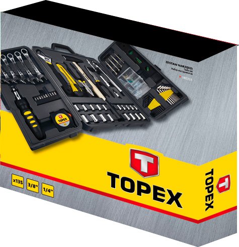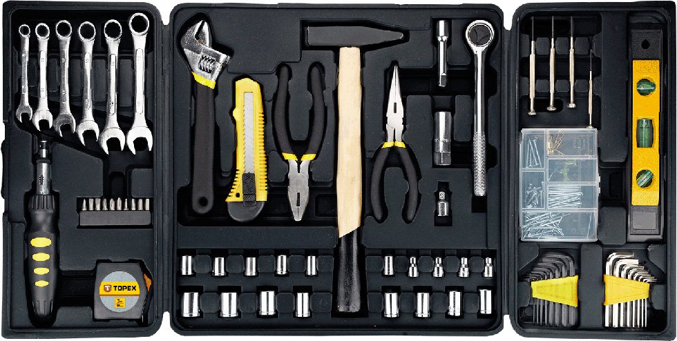 - Наличие в наборе Шестигранные ключи, Торцевые головки 3/8", Торцевые головки 1/4", Пассатижи, Отвертки, Нож, Молоток, Комбинированные ключи, Ключ разводной, Длинногубцы, Гаечные ключи, Биты