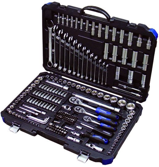 - Наличие в наборе Шестигранные ключи, Удлинители 3/8", Удлинители 1/4", Удлинители 1/2", Трещотка 3/8", Трещотка 1/4", Трещотка 1/2", Торцевые головки 3/8", Торцевые головки 1/4", Торцевые головки 1/2", Отвертка под биты, Головки свечные, Гаечные ключи, Биты