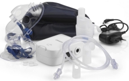 - Комплектация: Компрессор небулайзера Omron CompAir NE-C21 Basic (NE-C803-RU), небулайзерная камера, воздуховодная трубка (ПВХ, 100 см), загубник, насадка для носа, маска для взрослых (ПВХ), маска для детей (ПВХ), 5 запасных воздушных фильтров, адаптер переменного тока, сумка для хранения, руководство по эксплуатации, гарантийный талон