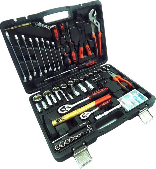 Универсальный набор: торцевые головки 1/2" (13 предметов), торцевые головки 1/4" (11 предметов), глубокие торцевые головки 1/2" (2 предмета), глубокие торцевые головки 1/4" (5 предметов), трещотки (1/2", 1/4"), кардан (1/2", 1/4"), удлинители (1/2", 1/4"), комбинированные ключи (8 предметов), пассатижи, клещи переставные, клещи универсальные, молоток, мульти-ножницы, отвертки (5 предметов), отвертка под биты 1/4", биты (насадки-отвертки), клеммы..