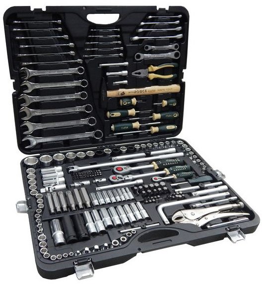 - Наличие в наборе Удлинители 3/8", Удлинители 1/4", Удлинители 1/2", Трещотка 3/8", Трещотка 1/4", Трещотка 1/2", Торцевые головки 3/8", Торцевые головки 1/4", Торцевые головки 1/2", Пассатижи, Отвертки, Отвертка под биты, Молоток, Комбинированные ключи, Головки свечные, Гаечные ключи, Биты