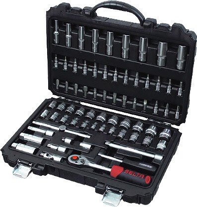 - Наличие в наборе Удлинители 3/8", Трещотка 3/8", Торцевые головки 3/8", Отвертка под биты, Биты