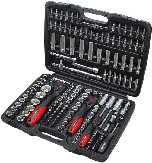 - Наличие в наборе Шестигранные ключи, Удлинители 3/8", Удлинители 1/4", Удлинители 1/2", Трещотка 3/8", Трещотка 1/4", Трещотка 1/2", Торцевые головки 3/8", Торцевые головки 1/4", Торцевые головки 1/2", Отвертка под биты, Биты