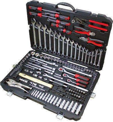 - Наличие в наборе Удлинители 3/8", Удлинители 1/4", Удлинители 1/2", Трещотка 3/8", Трещотка 1/4", Трещотка 1/2", Торцевые головки 3/8", Торцевые головки 1/4", Торцевые головки 1/2", Пассатижи, Отвертки, Молоток, Комбинированные ключи, Ключ разводной, Зажимные клещи, Биты