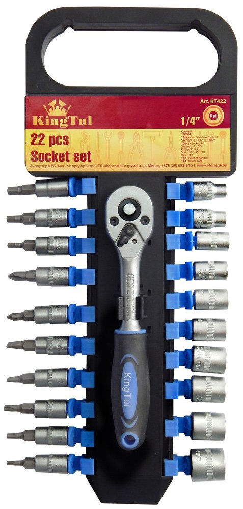 - Наличие в наборе Трещотка 1/4", Торцевые головки 1/4", Биты