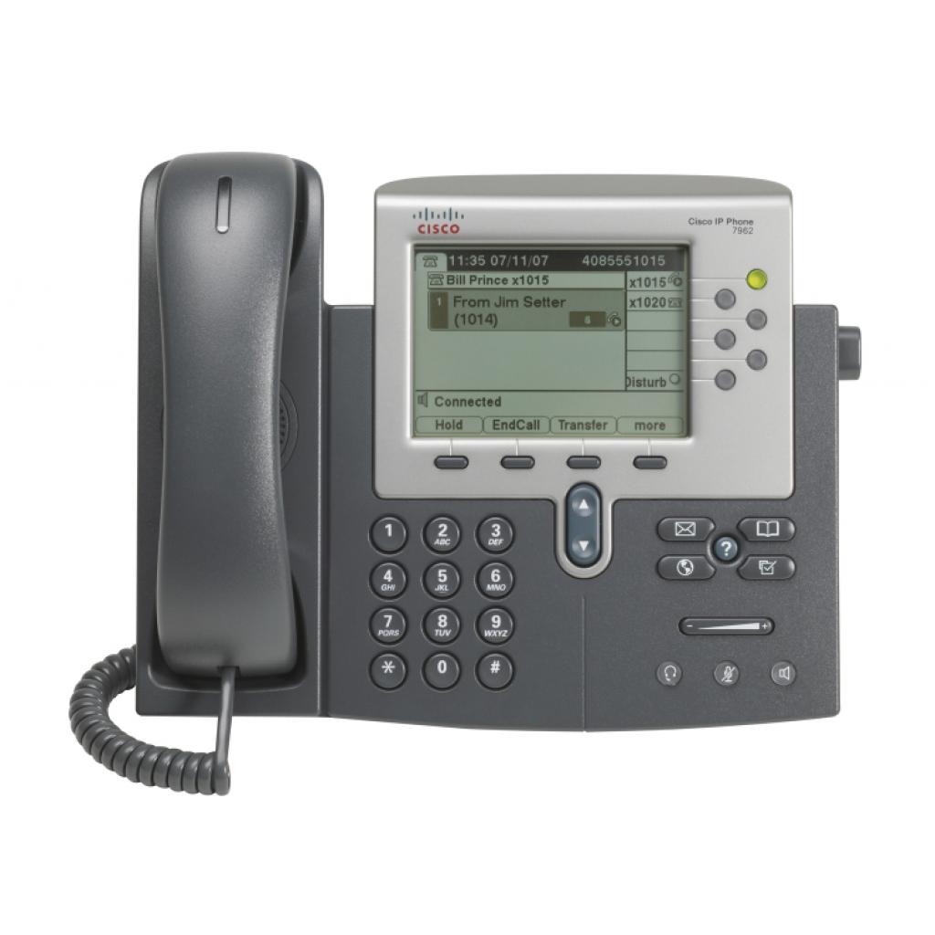 IP телефон CISCO CP-7962G = є повнофункціональним IP-телефоном із спікерфоном і телефонною трубкою, спеціально розробленими для широкосмугового звуку. Він призначений для менеджерів і помічників керівників. IP-телефон має великий рідкокристалічний дисплей (4-бітові відтінки сірого), що відображає дату і час, ім'я групи виклику, номер групи виклику, набраний номер та інформацію.