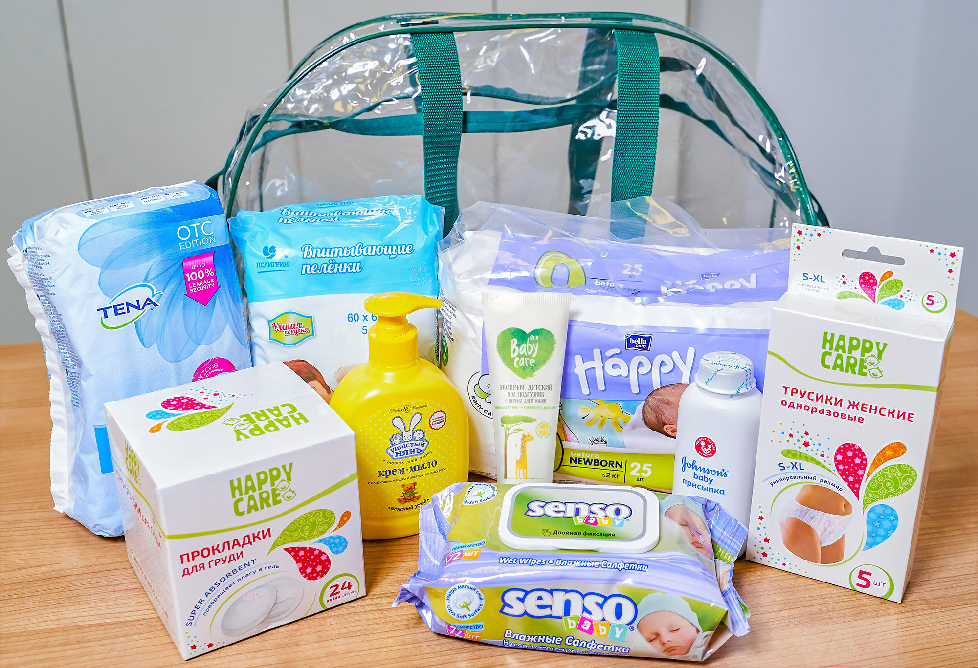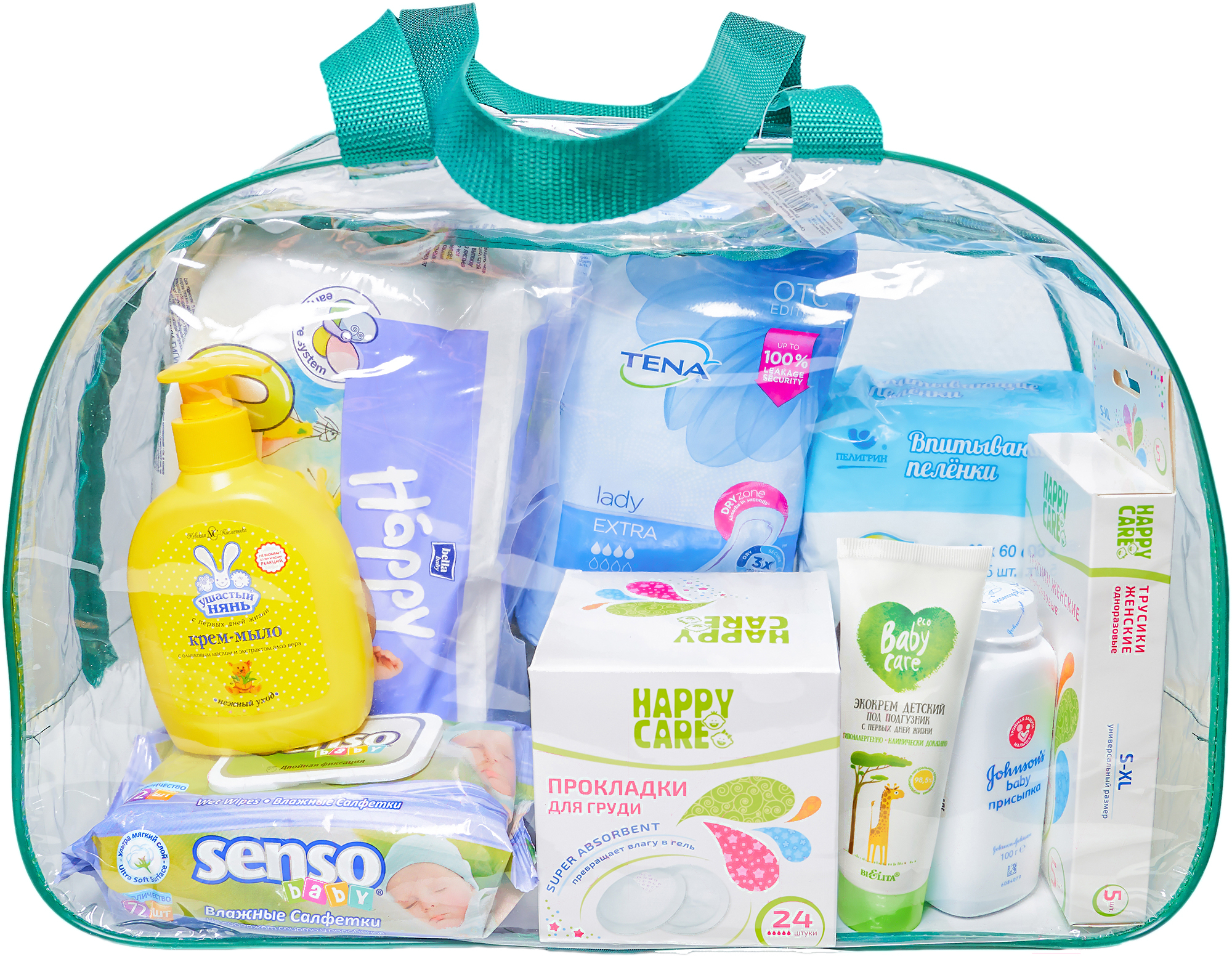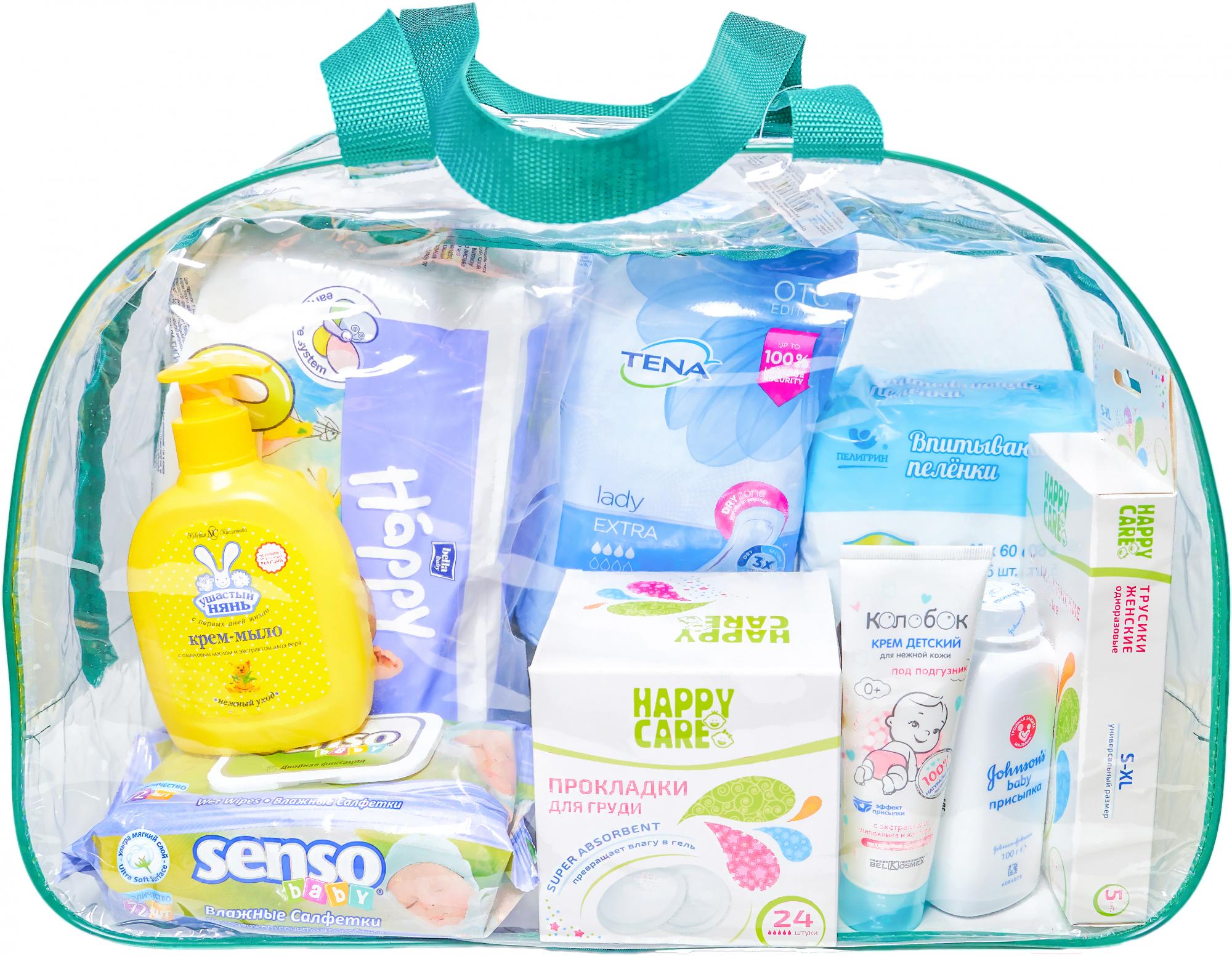 - Наполнение сумки подгузники, мыло детское, присыпка, крем детский, влажные салфетки, пеленки одноразовые, прокладки урологические, прокладки для бюстгалтера, трусы послеродовые