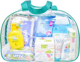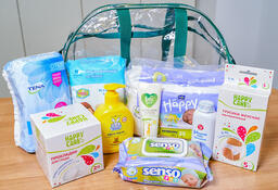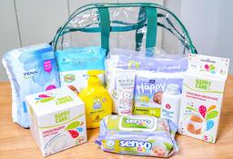 - Комплектация подгузники, мыло детское, присыпка, крем детский, влажные салфетки, пеленки одноразовые, прокладки урологические, прокладки для бюстгалтера, трусы послеродовые