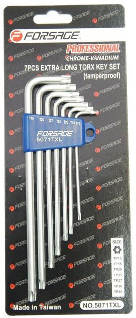Набор угловых шестигранных ключей, экстра-длинных, с отверстием (7 предметов): Т10Н, Т15Н, Т20Н, Т25Н, Т27Н, Т30Н, Т40Н.