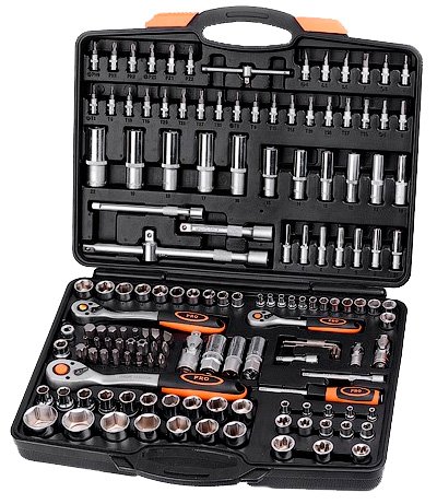 - Наличие в наборе Шестигранные ключи, Удлинители 1/4", Удлинители 1/2", Трещотка 3/8", Трещотка 1/4", Трещотка 1/2", Торцевые головки 3/8", Торцевые головки 1/4", Торцевые головки 1/2", Отвертка под биты, Головки свечные, Биты