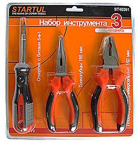 Универсальный набор инструментов состоящий из 3 предметов. В набор входят: плоскогубцы универсальные 150 мм; тонкогубцы 150 мм; отвертка с 6 битами.