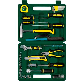 - Наличие в наборе Шестигранные ключи, Трещотка 1/2", Торцевые головки 1/2", Отвертки, Отвертка под биты, Нож, Молоток, Ключ разводной, Индикаторы, Биты