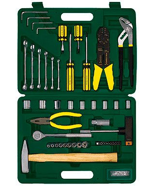 - Наличие в наборе Шестигранные ключи; Трещотка 1/2"; Торцевые головки 1/2"; Пассатижи; Отвертки; Отвертка под биты; Молоток; Комбинированные ключи; Ключ разводной; Биты