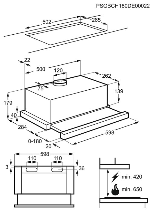 выдвижная, встраивается в навесной шкафчик отвод / циркуляция макс. производительность 370 куб. м/ч ширина для установки 60 см