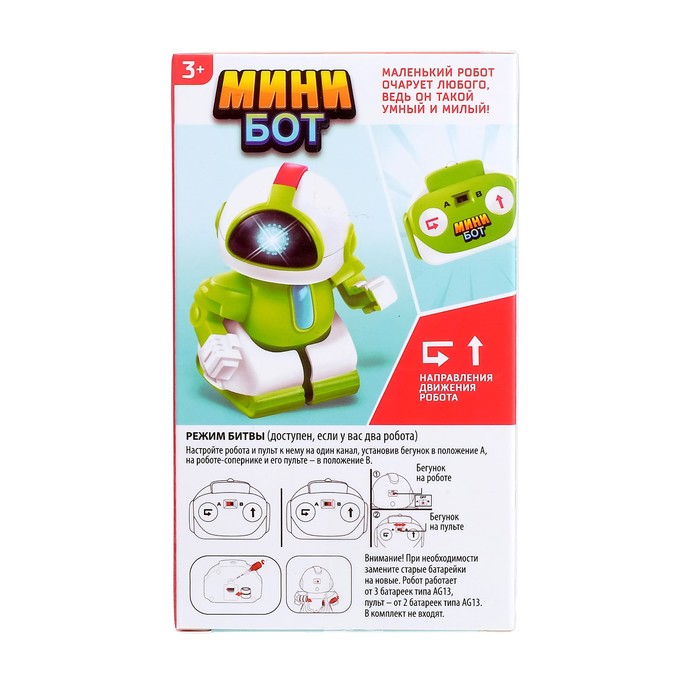 <h2 class="h4"> Новый дом для космического гостя </h2><p>Добродушный пришелец «Минибот» прилетел на Землю с единственной целью — найти новых друзей. Робот с первых секунд завладеет вниманием малыша. Сынишке понравится яркий внешний вид игрушки и простое, понятное управление. </p><h2 class="h4">Игровые возможности </h2><p> «Минибот» умеет двигаться вперёд, назад и разворачиваться при движении задним ходом. Мальчишка будет играть с роботом, используя пульт радиоуправления, или устраивать состязания с товарищем, у которого есть такой же герой. Для этого необходимо лишь настроить пульт и робота на определённую волну и начать поединок! </p><h2 class="h4">Космическая польза </h2><p>Игры с дружелюбным «Миниботом» способствуют развитию образного мышления, координации движений и воображения. С забавным пришельцем ребёнок придумает множество увлекательных сюжетно-ролевых игр и невероятно весело проведёт время. </p><p>Робот работает от 3 батареек типа AG13, пульт — от 2 батареек типа AG13. Элементы питания в комплектацию не входят. </p><p>Для детей старше 8 лет. </p>
