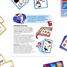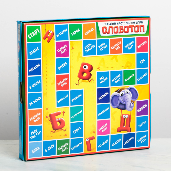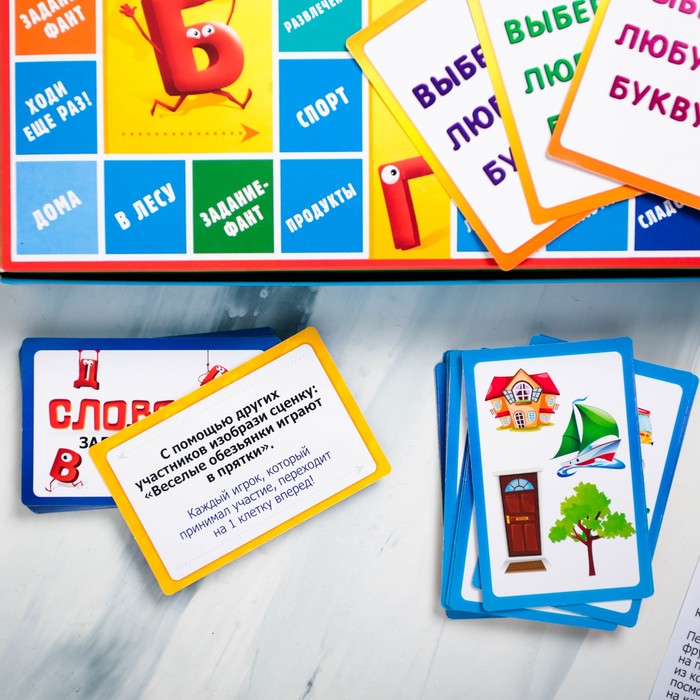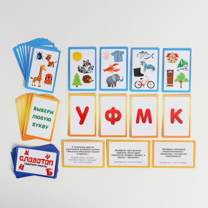 Участники по очереди вытягивают карточки из колоды с буквами, перемещаются по игровому полю и называют слова, которые относятся к разным темам. Выигрывает тот, кто первым дойдёт до клетки «Финиш»!