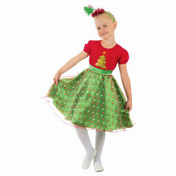 Карнавальный костюм «Ёлочка в горошек» сделает вашу малышку самой нарядной на любом празднике! Яркое платье с пышной юбочкой подарит комфорт в течение всего дня. Верх выполнен из хлопка, низ — из полиэстера. Пояс, вшитый в платье, завязывается сзади в красивый бант. Причёску украсит ободок с фигуркой зимнего деревца.