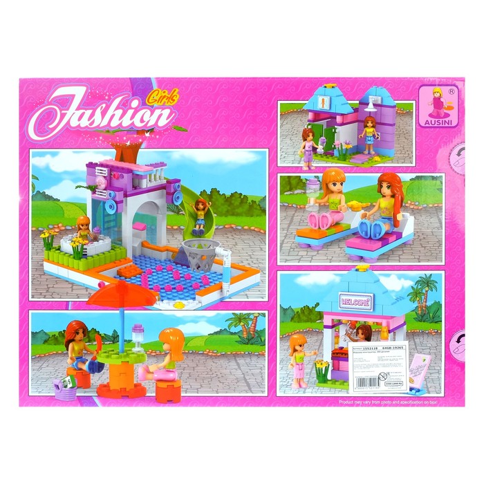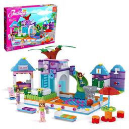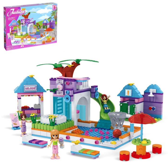 Набор содержит 485 деталей и позволяет сконструировать всё, что необходимо для летнего досуга: бассейн с горкой, закусочную, зону для игры в баскетбол и шезлонги для принятия солнечных ванн.