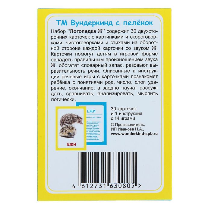 <h2 class="h4">Произносим правильно</h2><p>Набор состоит из 30 двусторонних логопедических карточек с картинками, скороговорками и стихами. Он поможет малышу в игровой форме овладеть правильным произношением звука «Ж», расширить словарный запас и развить грамотную речь. Такие занятия познакомят ребёнка с понятиями «род», «слог», «ударение» и «окончание».</p><h2 class="h4">Для кого?</h2><p>Для детей от 3 до 8 лет.</p><h2 class="h4">В комплект входит:</h2><ul><li>30 карточек,</li><li>инструкция с 14 играми.</li></ul>