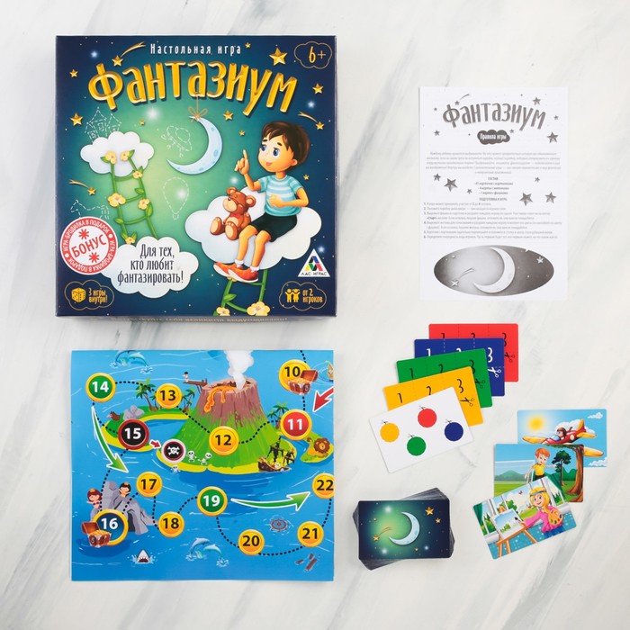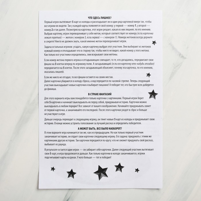 <h2 class="h4">Для тех, кто любит фантазировать</h2><p>Каждый ребёнок обожает выдумывать. Во что может превратиться история про мальчика, если на своём пути он встретит корабль, полный пиратов и летящий на всех парусах на поиски праздничного торта? Внутри вы найдёте целых 3 варианта игры, которые перенесут вас в мир фантазий и невероятных приключений. </p><h2 class="h4">Придумывайте слова и выполняйте задания! </h2><p>Внутри вы найдёте 45 карточек с удивительными изображениями. Переворачивайте их, придумывайте истории и загадывайте, какая картинка в них лишняя. Другие участники должны понять ход ваших мыслей и указать на эту карту. </p><p>В других вариантах игры вам нужно будет складывать из карточек удивительные сюжеты и придумывать новые истории по уже выложенным картинкам, меняя рассказы, которые сочинили другие участники. </p><h2 class="h4">Бонус: игра-бродилка</h2><p>Также внутри вы найдёте бонус — игру-бродилку про пиратов. Вырежьте фишки, киньте специальный жетон на поле, передвигайтесь по клеткам и внимательно смотрите на специальные обозначения на поле. Почувствуйте себя настоящими морскими разбойниками! </p><h2 class="h4">В комплекте: </h2><ul><li>50 карточек; </li><li>игровое поле на обороте коробки; </li><li>правила; </li><li>игра-бродилка про пиратов. </li></ul><h2 class="h4">Почувствуйте себя великими выдумщиками! </h2>