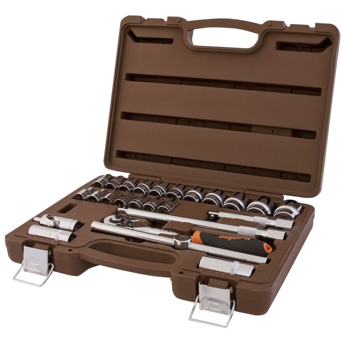 <h2 class="h4">Комплектация:</h2><ul><li>головки торцевые, 18 шт. (8, 9, 10, 11, 12, 13, 14, 15, 16, 17, 18, 19, 21, 22, 24, 27, 30, 32 мм); </li><li>головка свечная (16 мм); </li><li>головка свечная (21 мм); </li><li>удлинители, 2 шт. (125 и 250 мм); </li><li>трещоточная рукоятка; </li><li>шарнир карданный; </li><li>вороток т-образный; </li><li>пластиковый кейс. </li></ul>