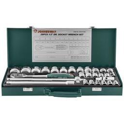 <h2 class="h4">Комплектация:</h2><p><b>1/2DR:</b></p><ul><li>головки торцевые, 24 шт. (8, 9, 10, 11, 12, 13, 14, 15, 16, 17, 18, 19, 20, 21, 22, 23, 24, 25, 26, 27, 28, 30, 32, 34 мм); </li><li>рукоятка трещоточная (278 мм); </li><li>вороток Т-образный (300 мм); </li><li>удлинитель (250 мм); </li><li>шарнир карданный; </li><li>металлический кейс. </li></ul>