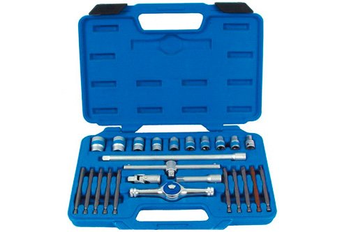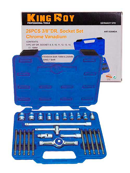 - Наличие в наборе Удлинители 3/8", Трещотка 3/8", Торцевые головки 3/8", Биты