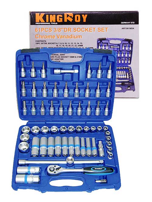 - Наличие в наборе Удлинители 3/8", Трещотка 3/8", Торцевые головки 3/8", Головки свечные