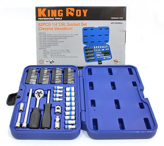 - Наличие в наборе Удлинители 1/4", Трещотка 1/4", Торцевые головки 1/4", Биты