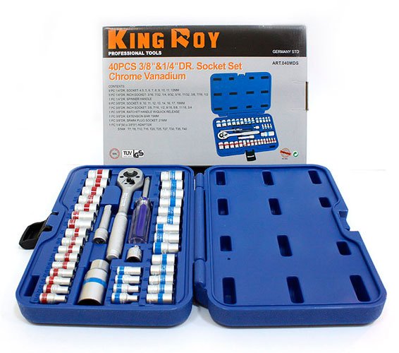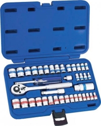 - Наличие в наборе Удлинители 3/8", Трещотка 3/8", Торцевые головки 3/8", Торцевые головки 1/4", Отвертка под биты, Головки свечные