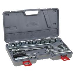 Комплектация: 13 сменных головок с присоединительным квадратом 1/2" (12,5 мм), свечная головка (21 мм), трещотка, 6 рожковых ключей, два удлинителя (125, 250 мм), плоскогубцы и шарнир, 2 отвёртки (SL6, PH3).